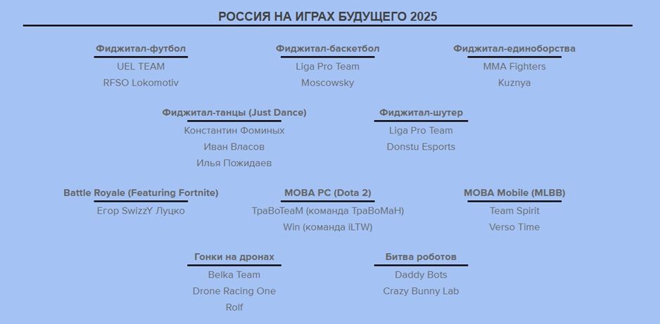 В фиджитал-шутере можно будет поддержать Liga Pro Team и Donstu Esports (команда ДГТУ), в фиджитал-борьбе — MMA Fighters и Kuznya. В других видах также представлены минимум два участника или две команды из России.