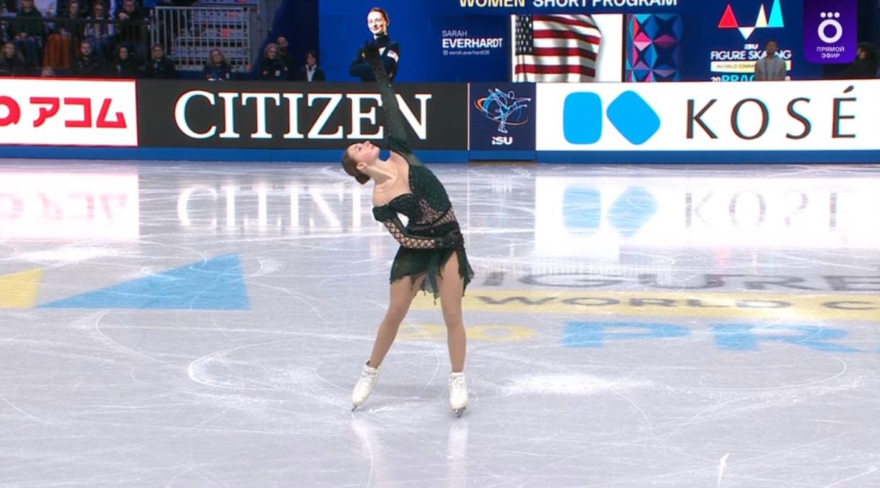 Достойный прокат выдала Сара под ирландские мотивы, это её дебют на соревнованиях такого уровня! Тренируется спортсменка в одной группе с Ильёй Малининым, у бортика её встречал Роман Скорняков. В начале проката Эверхардт была более сосредоточена на элементах, но на дорожке постаралась презентовать по максимуму.
