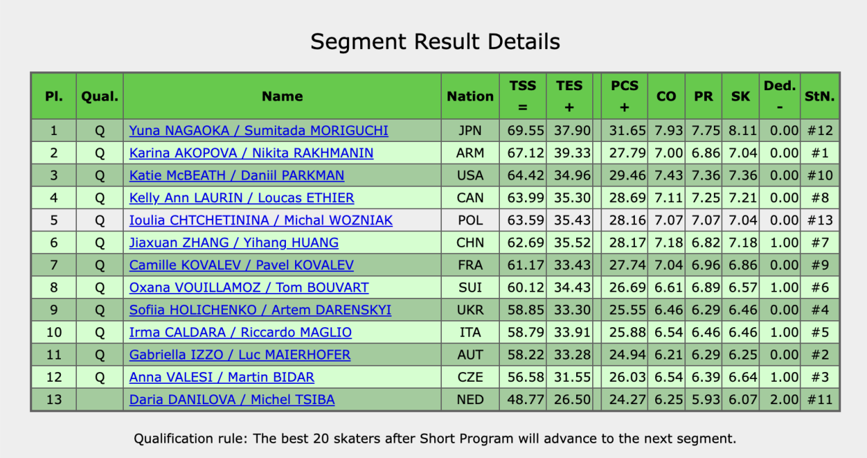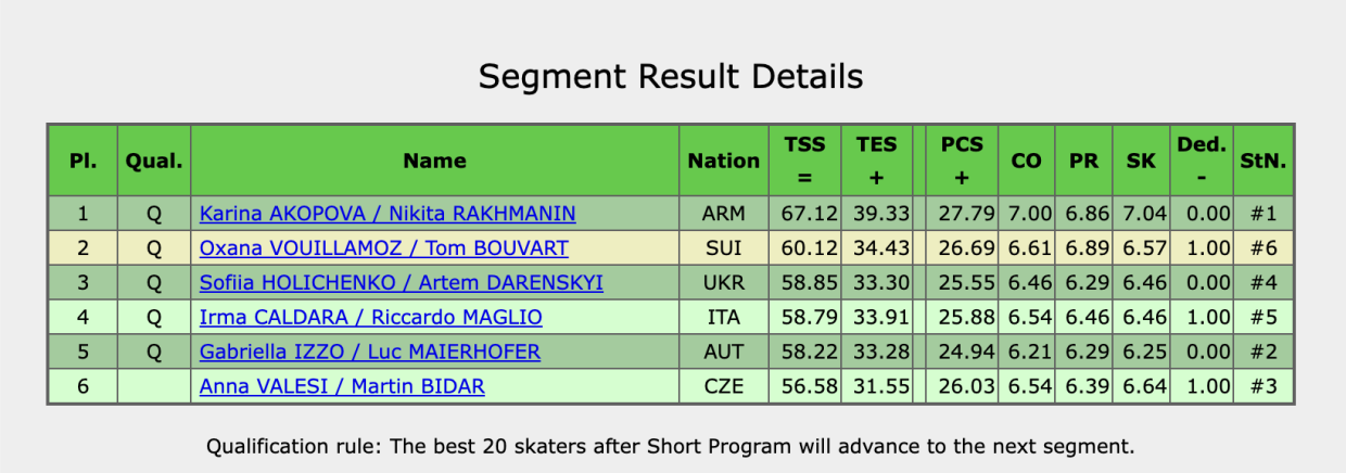 Положение пар в короткой программе после двух разминок