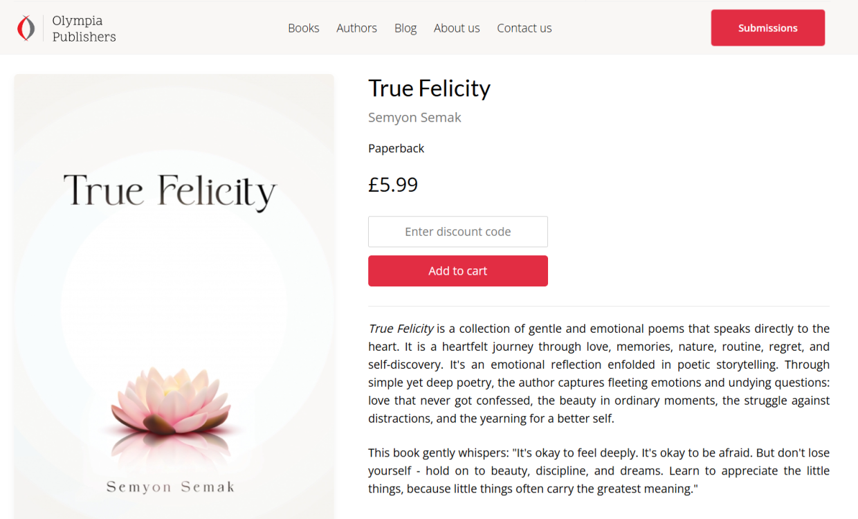 «Истинное счастье» — это сборник нежных и эмоциональных стихотворений, которые обращаются прямо к сердцу. Это проникновенное путешествие по миру любви, воспоминаний, природы, рутины, сожалений и самопознания. Это эмоциональное размышление, воплощённое в поэтическом повествовании. С помощью простой, но глубокой поэзии автор улавливает мимолетные эмоции и вечные вопросы: любовь, которая так и не была признана, красоту обыденных моментов, борьбу с отвлекающими факторами и стремление к лучшей версии себя.