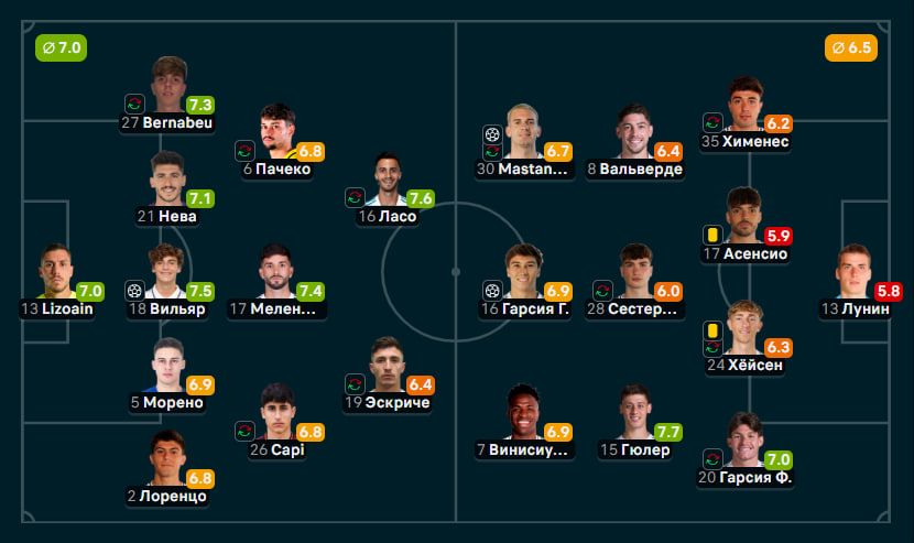 Наивысшую оценку в составе «Реала» получил турецкий атакующий полузащитник Арда Гюлер (7,7). Среди всех игроков встречи наивысший рейтинг Flashscore выставил форварду «Альбасете» Хефте Бетанкору — 8,8. Испанец вышел на замену на 58-й минуте, отметился дублем, включая победный гол, и получил жёлтую карточку.