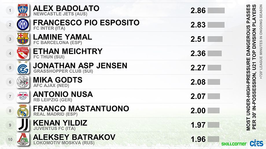 Первое место в этом списке занимает полузащитник австралийского клуба «Ньюкасл Джетс» Алекс Бадолато с показателем 2,86. На третьем месте находится Ламин Ямаль из «Барселоны», его показатель составляет 2,51. Полузащитник мадридского «Реала» Франко Мастантуоно занимает восьмую строчку с показателем 2,00. На девятой строчке – форвард «Ювентуса» Кенан Йылдыз, его показатель равен 1,97.
