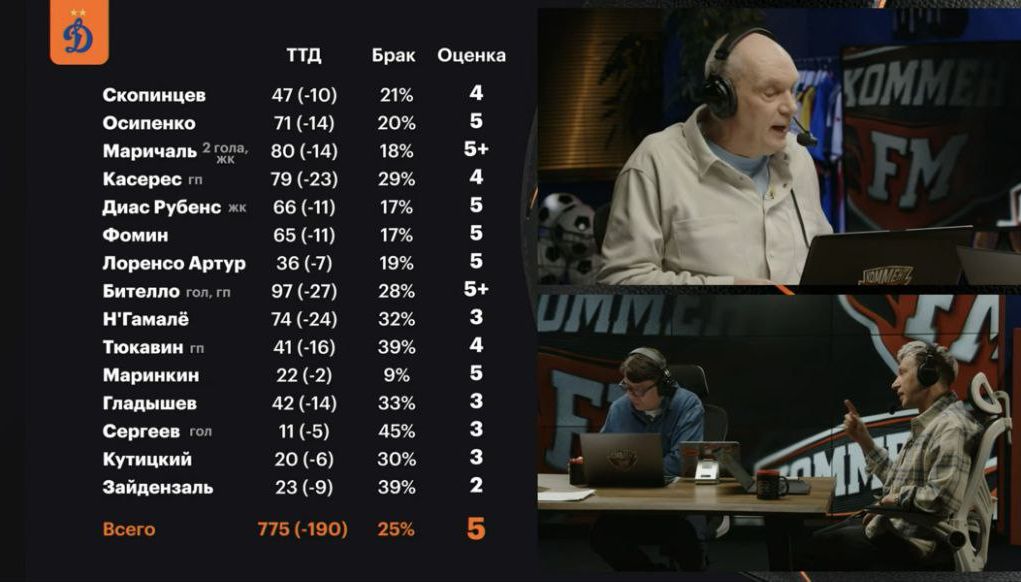 Единственную двойку в составе «Динамо» получил защитник Леон Зайдензаль. Он вышел на поле после перерыва и был заменён на 73-й минуте. По подсчётам Бубнова, Зайдензаль выполнил 23 ТТД при 39% брака.