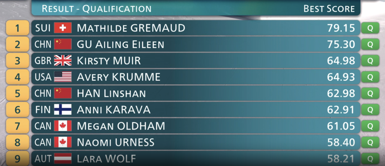 Квалификация в женском слоупстайле подошла к концу. Ниже — список спортсменок, отобравшихся в финал.
