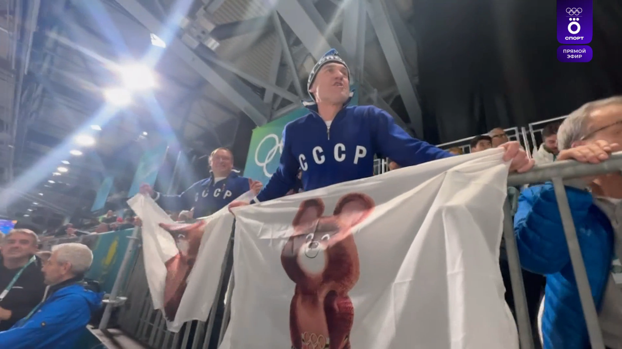Наши на трибунах в Милане! Фанаты принесли на конькобежный спорт флаг с олимпийским Мишкой. Ладно Мишка, зрители были одеты в популярные нынче свитеры с аббревиатурой СССР 🤪