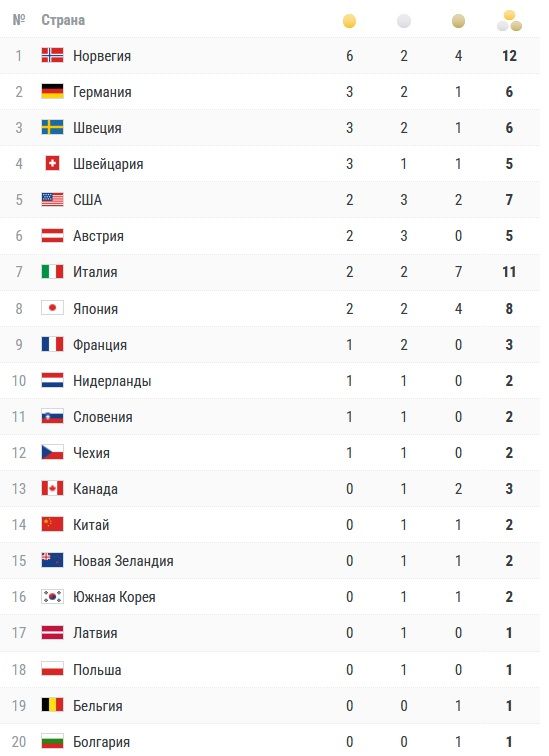 Норвегия упрочила лидерство по золотым медалям и вышла на первое место по общему числу наград. А Швеция запрыгнула в топ-3.