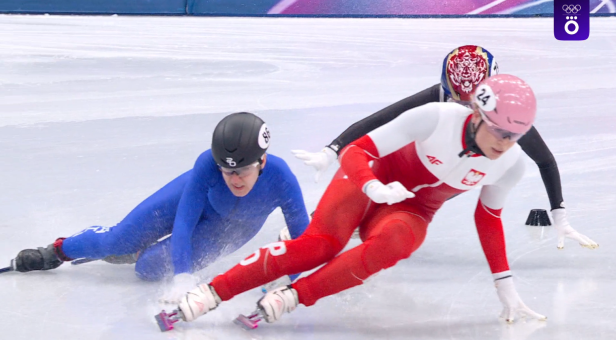 Забег Крыловой! И падение россиянки в момент, когда она пыталась атаковать польскую спортсменку. Увы, на этом участие Алёны в соревнованиях на дистанции в 500 метров подходит к концу.