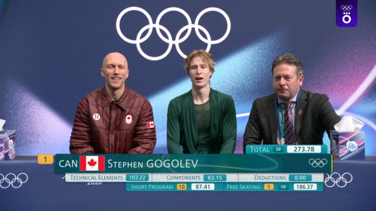Стивен Гоголев, выступающий за Канаду, чистенько выполнил аж три квада — сальхов, тулуп и сальхов в каскаде. Два трикселя сделал фигурист, причём один из них в каскаде вторым элементом, а это невероятно сложно. Без серьёзных визуальных ошибок откатал свою программу спортсмен.