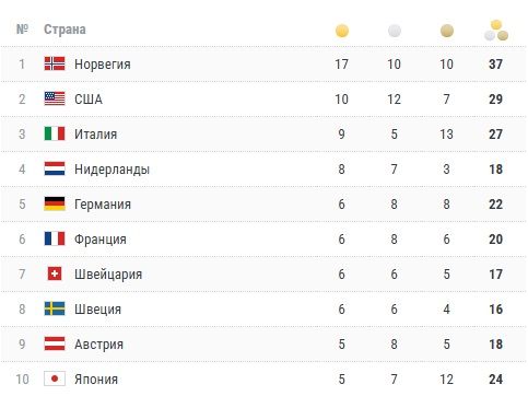 Вот как выглядит топ-10 медального зачёта перед последними двумя днями ОИ-2026. До Норвегии уже не дотянуться, а вот борьба за второе и третье места ещё возможна!