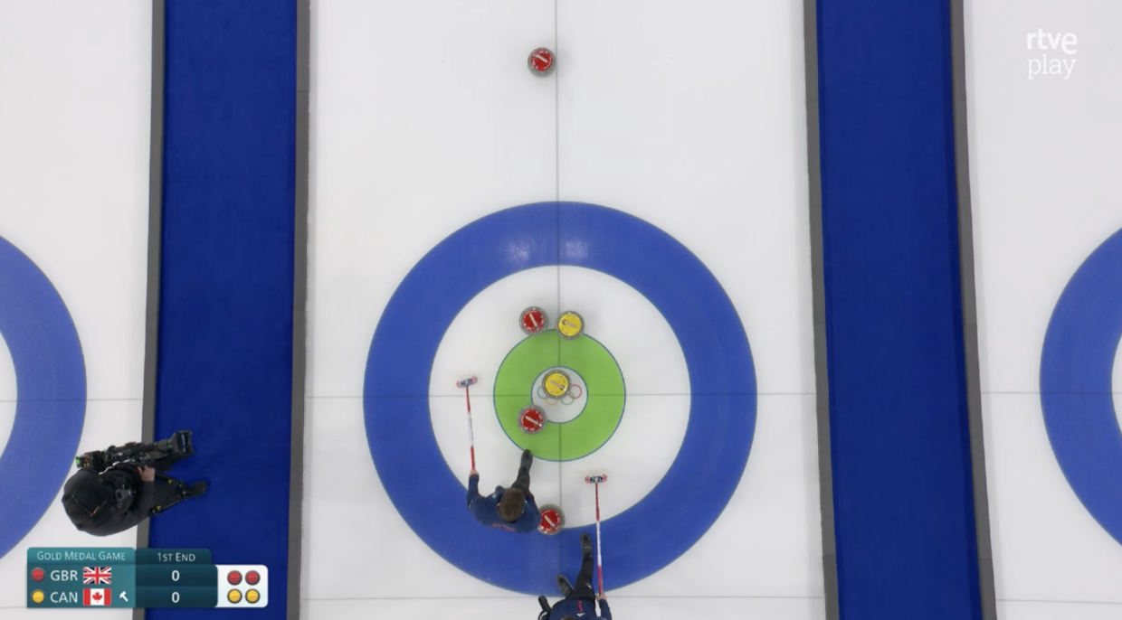 Мужской финал в кёрлинге тоже идёт. На табло пока по нулям.