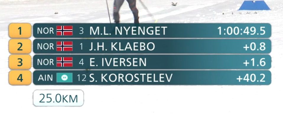 Хьюстон, у нас проблемы. Ровно в середине гонки уже 40 секунд уступает Коростелёв лидеру. Добраться до медалей будет почти нереально.