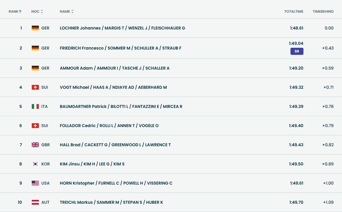 А вот как выглядит топ-10 у мужчин в бобслее (четвёрки). Два решающих заезда — завтра.