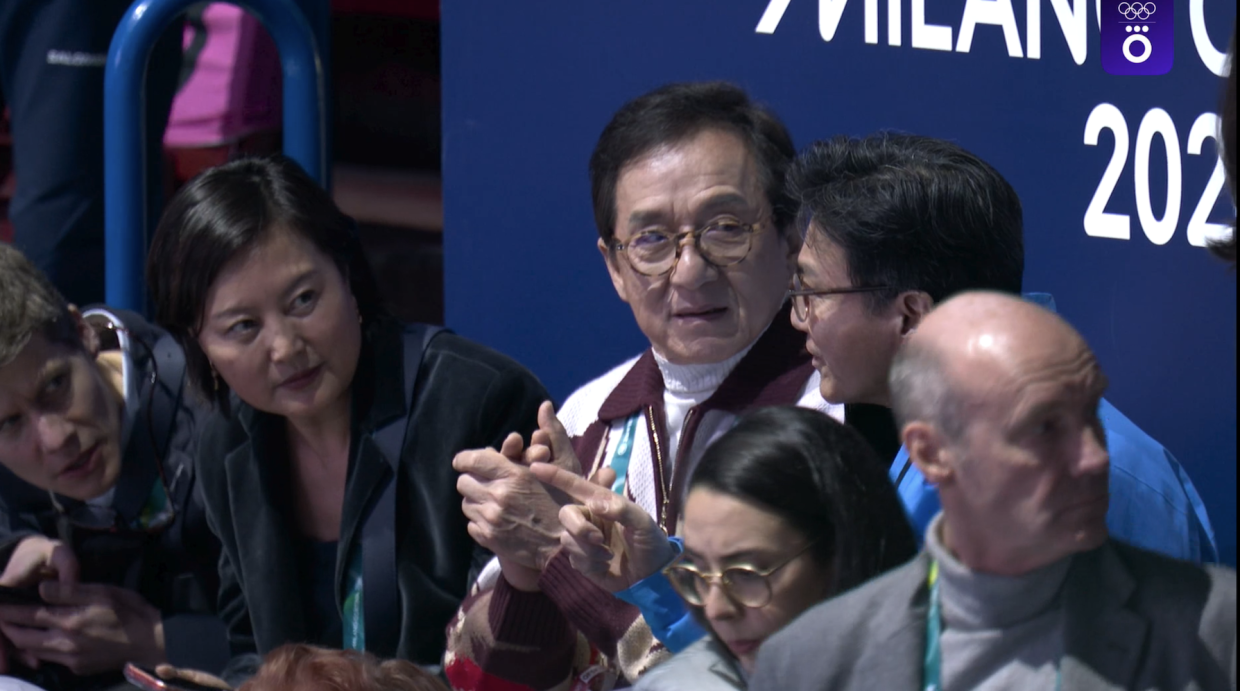 Ну этого человека, наверное, узнают многие. Да, Джеки Чан тоже на фигурном катании. Возможно, тоже выйдет с показательным номером.