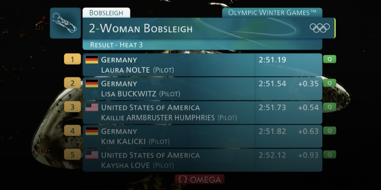 Итак, после первых двух заездов лидеров в бобслее у женщин (двойки) является экипаж 🇩🇪 немки Лауры Нольте. Она вместе с Деборой Леви везёт Лизе Буквиц и Неле Шутен 0,18 секунды. Ещё 0,23 американкам Кейлли Хамфрис и Джасмин Джонс.