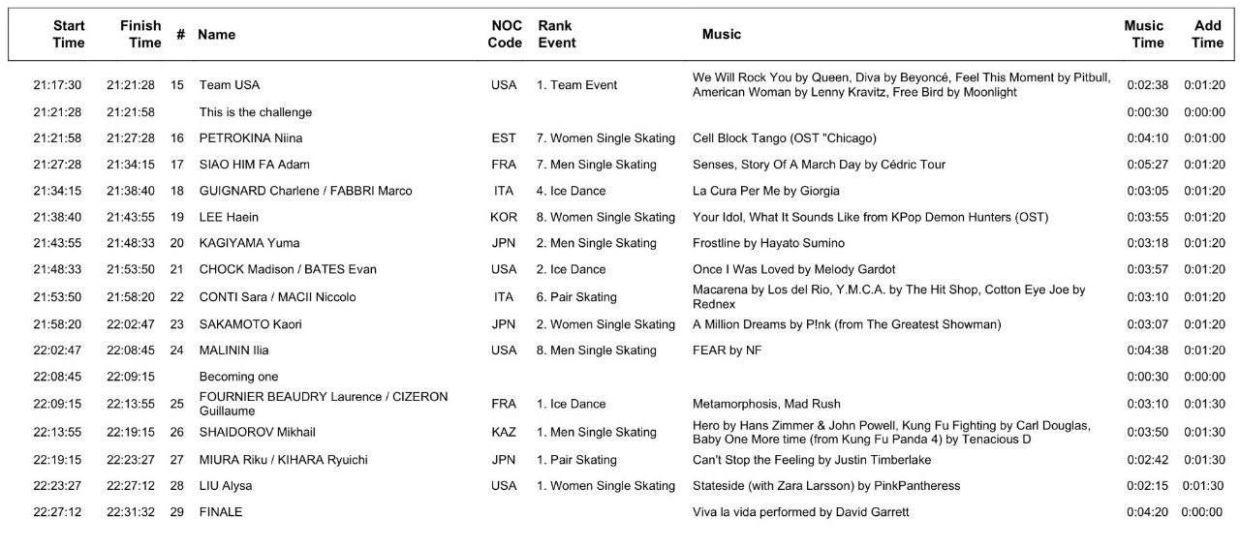 Спортсменка выступит под 13-м стартовым номером под песни исполнительницы Шакиры Waka Waka и Hips Don't Lie. С полным расписанием показательных выступлений фигуристов на Олимпиаде можно ознакомиться ниже.