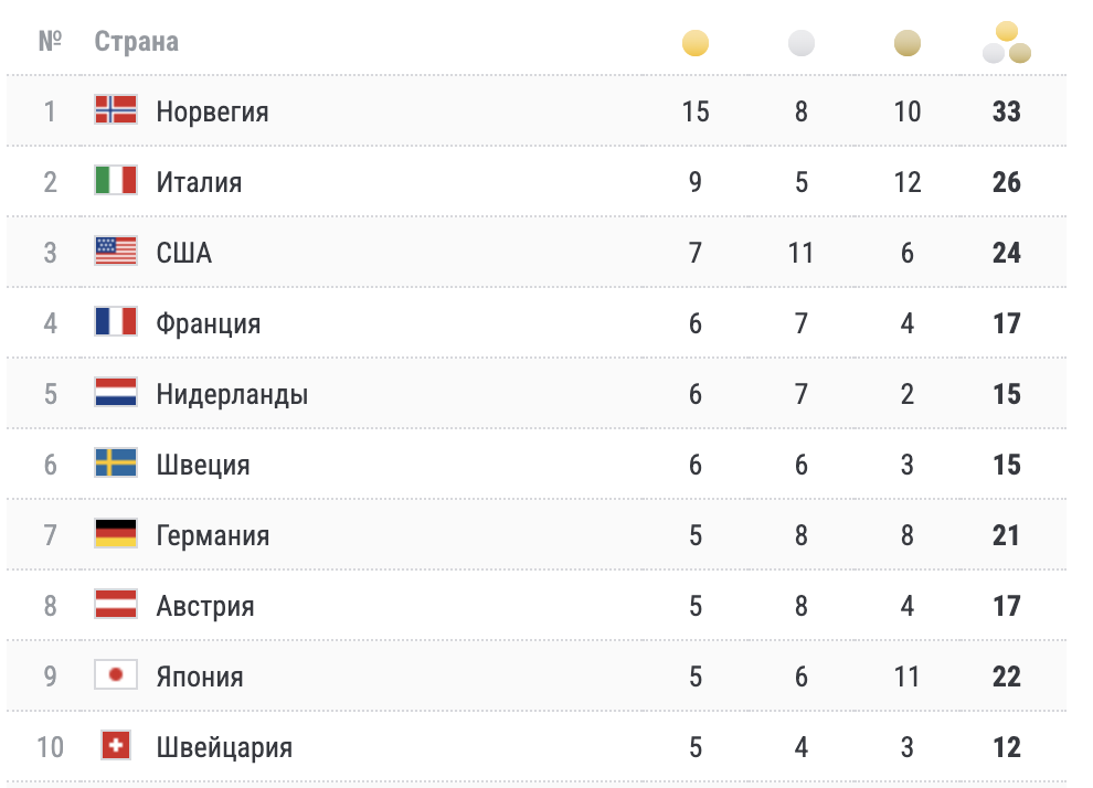 «Чемпионат» предлагает ознакомиться с топ-15 медального зачёта Олимпиады-2026 на 18 февраля 2026 года: