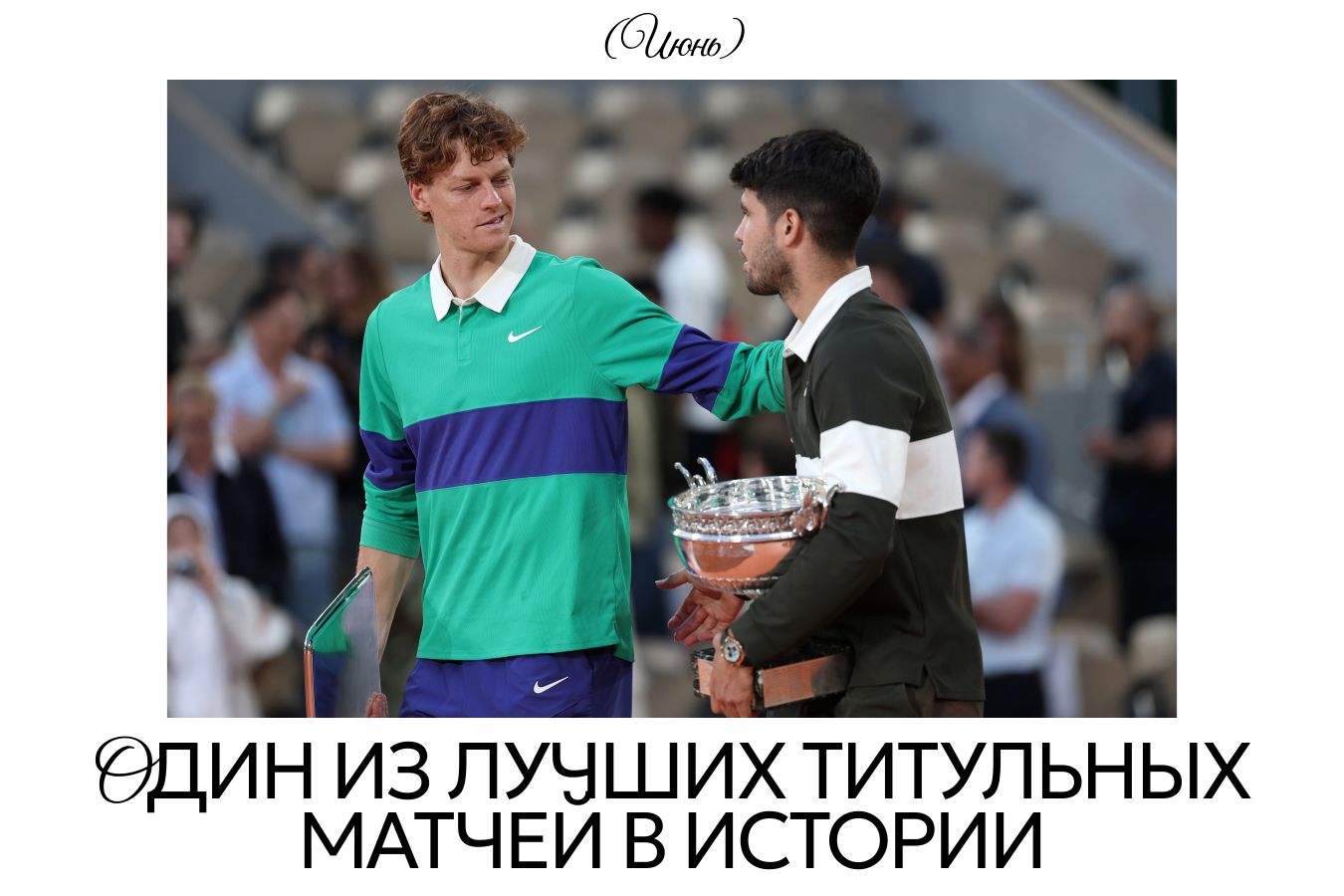 Карлос Алькарас и Янник Синнер в этом году шесть раз играли друг с другом. Испанец одержал четыре победы, итальянец — две. Особняком стоит финал «Ролан Гаррос», растянувшийся на пять сетов. Этот матч ещё до его окончания можно было называть одним из лучших в истории тенниса. Изюминкой стал тройной матчбол, с которого Карлос ушёл в четвёртом сете. Такое не забывается!