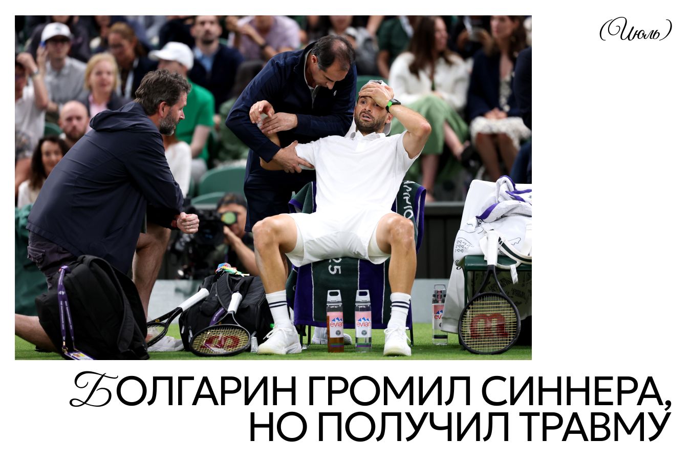 В этом году Григор Димитров пережил вторую молодость — на Уимблдоне так точно. В Лондоне 34-летний болгарин в первых трёх матчах проиграл лишь один сет. А в 1/8 финала нарвался на Янника Синнера. Столь грозный оппонент не смутил Димитрова, и он взял у него одну партию, затем и вторую… А в третьем сете всё неожиданно закончилось — драматично для Григора. При счёте 2:2 он получил травму грудной мышцы и вынужден был сняться. Синнер проследовал дальше и в итоге завоевал титул.